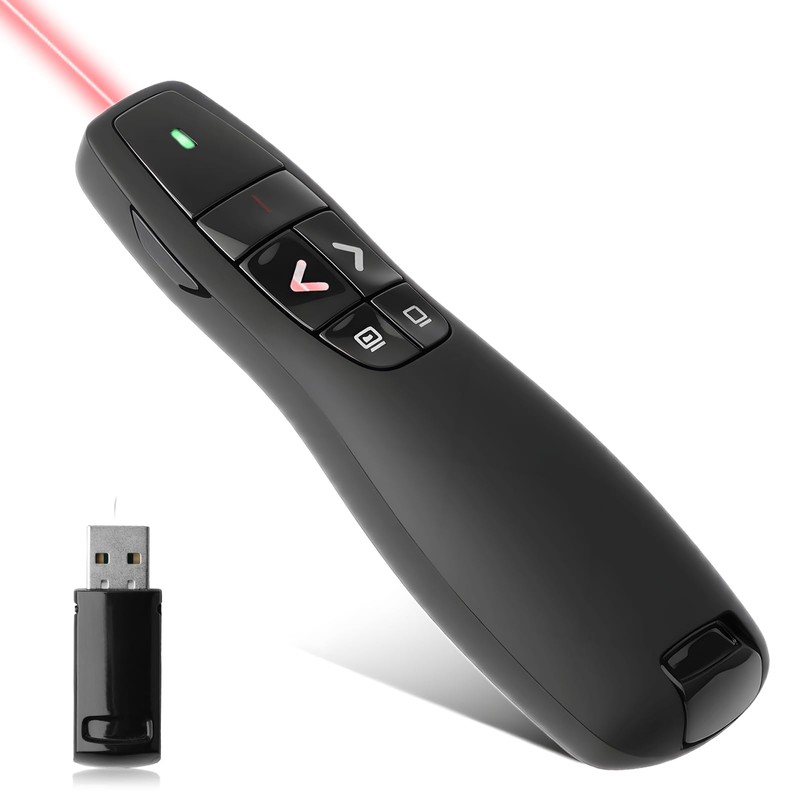 - Portable Integrated Design: The compact size and ergonomic design allow you to hold presentation pointer presenter comfortably in your hand and easily fit into your pocket. One-piece design, the mini USB receiver stores in presenter tail with a magnet system.The presentation clicker will be the perfect tool for your presentation, teaching and meeting, and it will be the best gift for your friends or family
