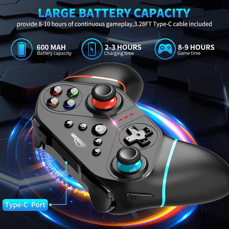 - đź ăLONG BATTERY LIFE & ONE-KEY WAKE-UPă Wireless controller for switch Built-in rechargeable long-lasting battery, only need to charge for 2-3 hours, our wireless pro controller can play continuously for up to 8 hours, and it will not affect normality while charging use. By stopping the gamepad for 5 minutes, it will automatically enter the sleep state, just wake up the switch and press the following button: HOME, automatically reconnect to avoid troublesome operations.