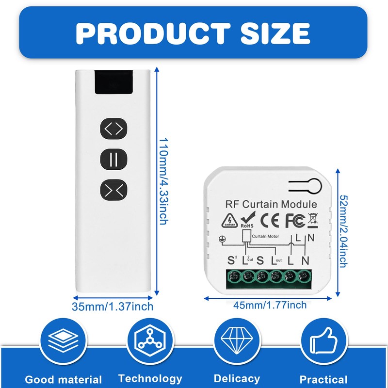- Easy to install: the wireless switch is very easy to use and effortless to learn. Remote control already taught to the receiver from the factory. The receiver (with a dimension of 5 x 4.5 cm) fits into any standard flush-mounted box. Receiver connected with power and your switch and motor, then off with remote control.