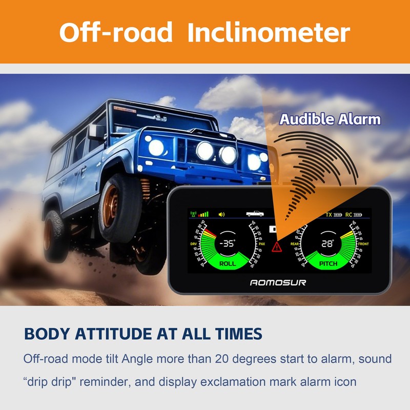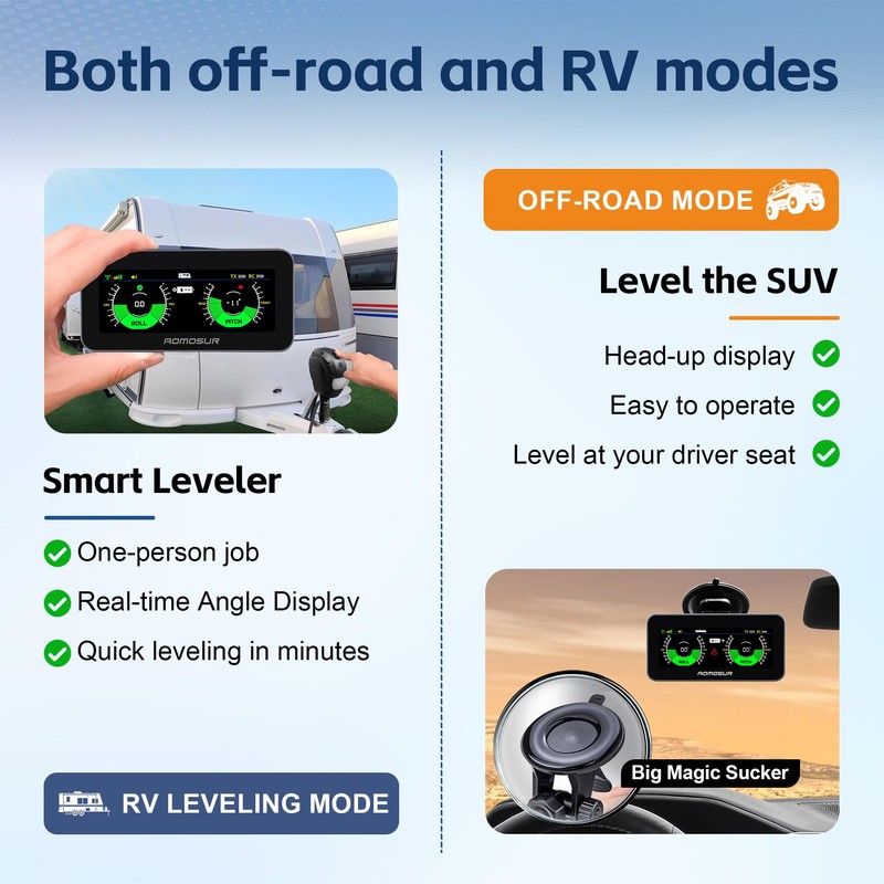- Dual-Mode Functionality: Seamlessly switch between RV Leveling Mode (0-4°) and Off-Road Mode (0-40°) to monitor tilt angles in real time, ensuring precise adjustments for both RV enthusiasts and off-road adventurers.