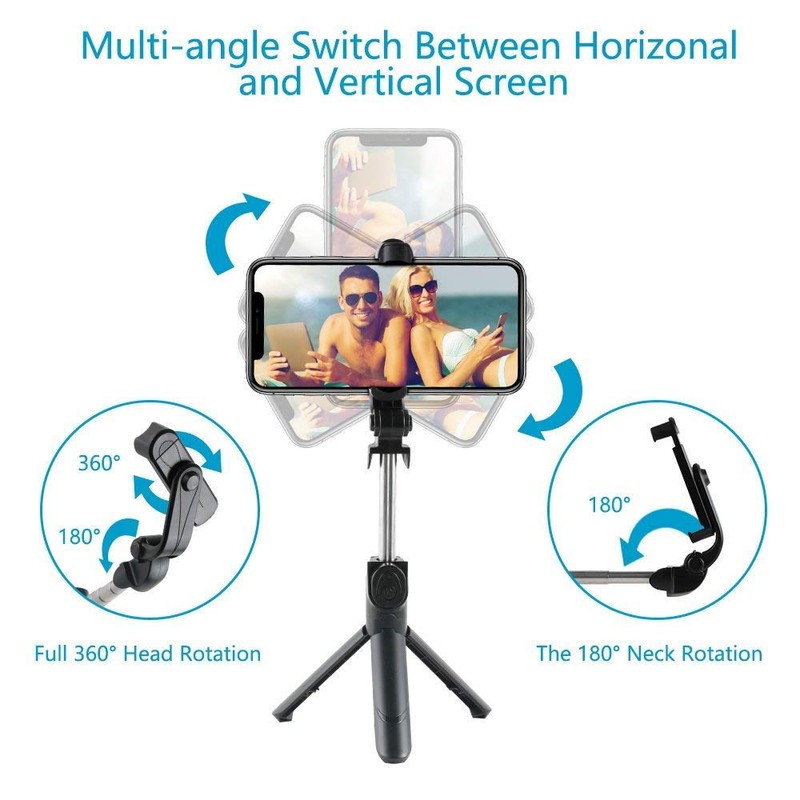 - MULTI-ANGLE SHOOTING & PORTABLE PHONE HOLDER: 3 ways to rotate the selfie stick tripod, 180°rotation head & 360° rotatable phone holder, you could rotate it and select horizontal or vertical camera mode to get the best angle photos.