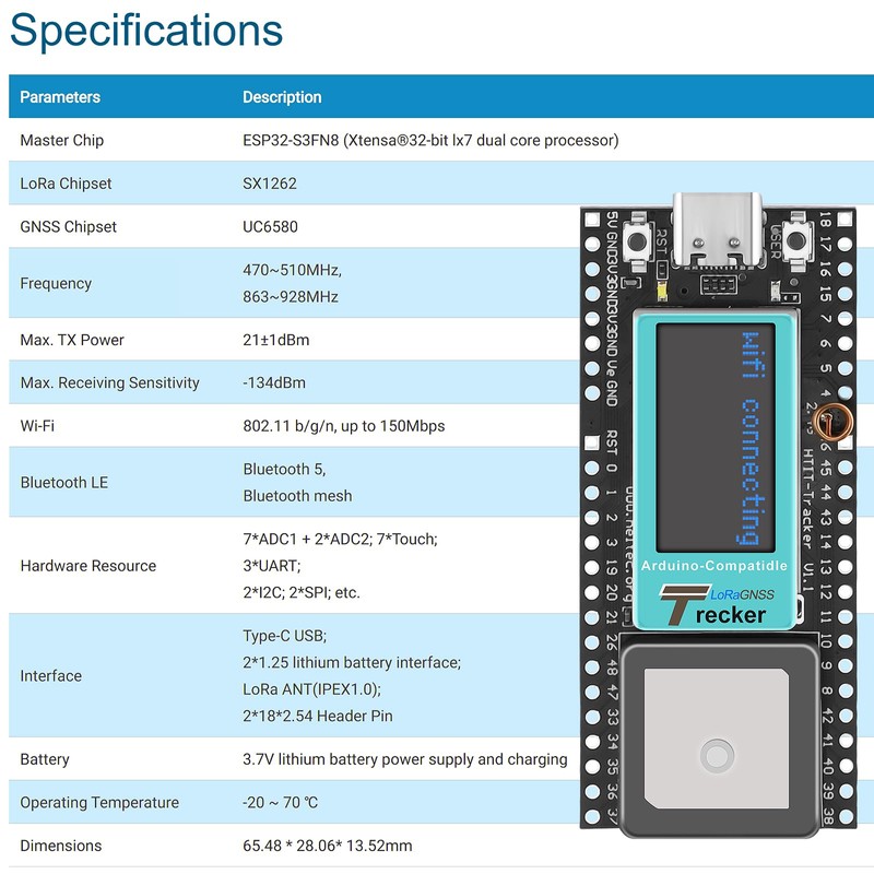 - Boasting ESP32-S3FN8+SX1262+UC6580 chips, the module is a powerhouse with Wi-Fi, LoRa, Bluetooth, and GNSS capabilities. Its dual-frequency, low-power design and advanced 22nm process technology ensure robust performance in varied environments