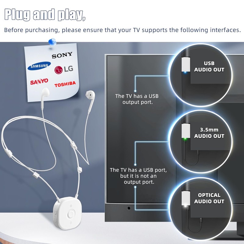 - Easy setup: With no need for a bulky transmitter or messy cables, our extremely easy connection method eliminates complicated operations and saves waiting time. Simply connect the transmitter to the audio output port on your TV, then turn on your wireless TV headphones to use. They auto-pair within 3 seconds.