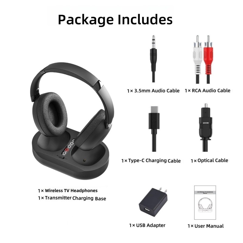 - 【What's in the package】Includes foldable wireless bluetooth headphones, transmitter base, optical fiber (Toslink) cable, RCA audio cable, USB adapter, Aux 3.5mm audio cable, USB-C cable and user manual. If you don't know the audio interface type of your device/TV or don't know how to connect the headphones, please contact us and we will get back to you within 24 hours. PLEASE MAKE SURE THAT THE DEVICE YOU WANT TO CONNECT MUST HAVE AN AUDIO OUT PORT OR HAVE BUILT-IN BLUETOOTH FUNCTION BEFORE PURCHASING, OTHERWISE THE HEADSET WILL NOT WORK.