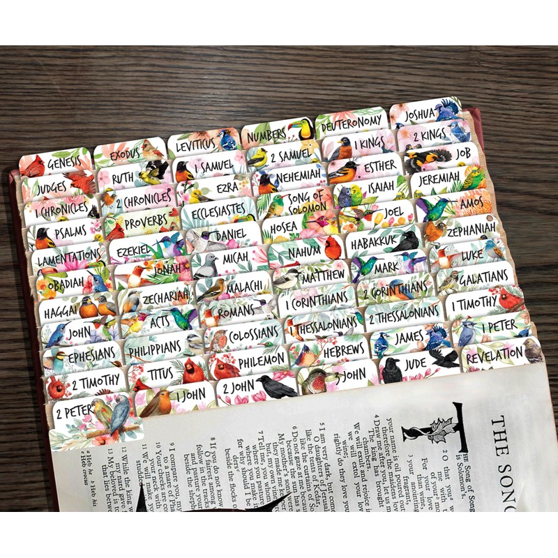 WIRESTER Large Print Laminated Bible Tabs, 80 Bible Index Tabs (66 Book Tabs and 14 Blank Tabs) Easy to Read and Navigation, Bible Journaling Supplies, Cute Bible Label Tabs for Women Men - Birds