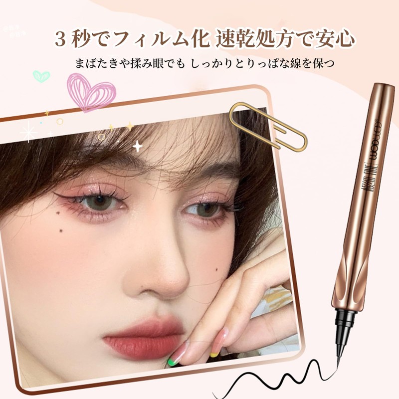 驚くほど繊細な0.01mmの極細筆先を備えたリキッドアイライナー。涙袋の影、下まつ毛のライン、まつ毛の隙間など、細かい部分も自在に描け、まるで生まれつき大きな瞳のような3Dアイを演出します。筆先は分岐しにくく、いつでも安定した描き心地を実現。さらに、15.5gの加重設計により、手元のブレを防ぎ、初心者でも安心して使えます。高密着フィルムが肌にぴたっと密着し、水・汗・皮脂にも強く、長時間美しいアイラインをキープ。描いてすぐ乾く速乾タイプなので、忙しい朝の時短メイクにも最適。1本でプロ級のアイメイクが手に入る、まさに電撃アイ製造機!