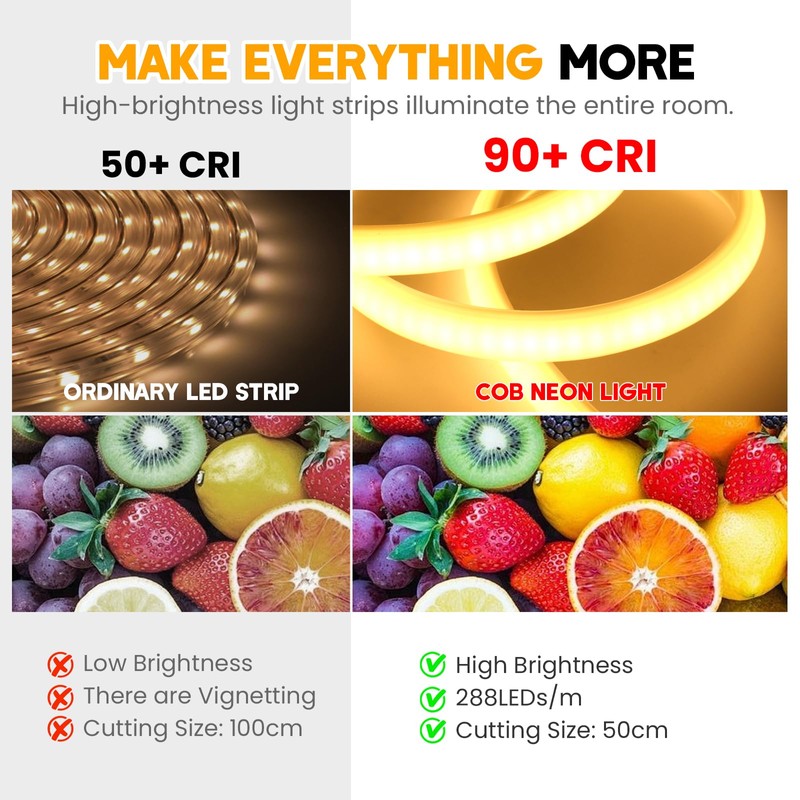 - Can be cut to size & flexible: the COB neon light strip can be cut every 50 cm, please cut along the cutting marks when cutting. And the strip can be bent at any angle, when you use the strip, please roll off the strip because rolled up, the strip heat is high, and then burn the strip.