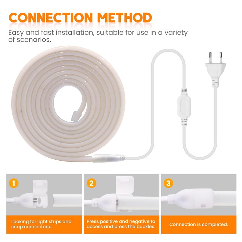 - IP65 waterproof: neon LED strip lights are suitable for indoor and outdoor use, such as roofs, gardens or patios, but please note that the ends of the strips are not waterproof and the strips should not be placed in water for safety reasons. Please seal the ends of the strip with waterproof glue or end plugs before use.