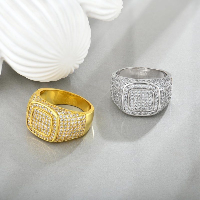 Wisbal 18K Gold Rings Cluster Diamond Band Micropave Mens Bling Ring Square Crystal Zircon Little Finger Ring for Men-Gold 10 Size Rings