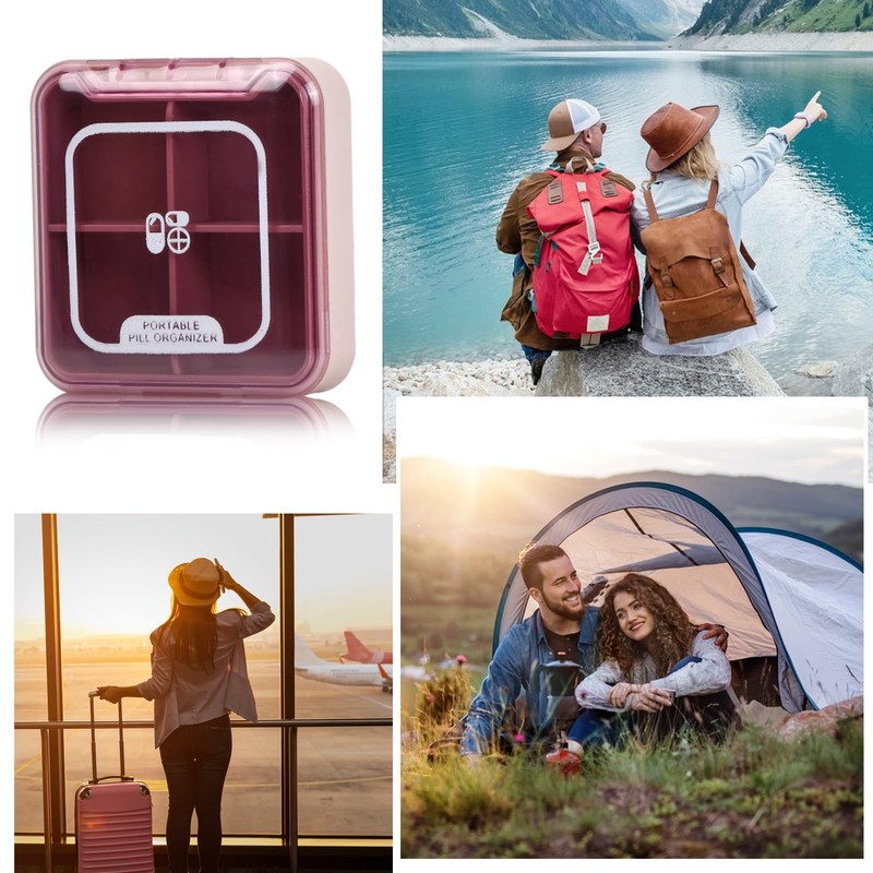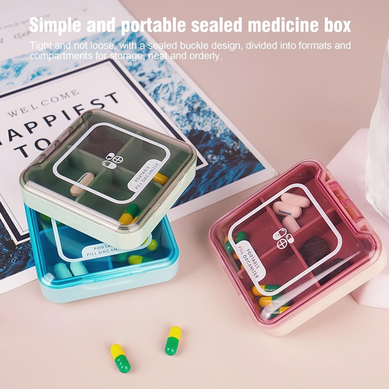 - Safe and portable: the size of the travel pill dispenser is 7.8 x 7.8 x 2 cm. The compartments are compact and can be easily stored in your bag or carry-on luggage. The push button stays firmly closed once locked. You don't have to worry about pets and children accidentally touching the pill box to open it.