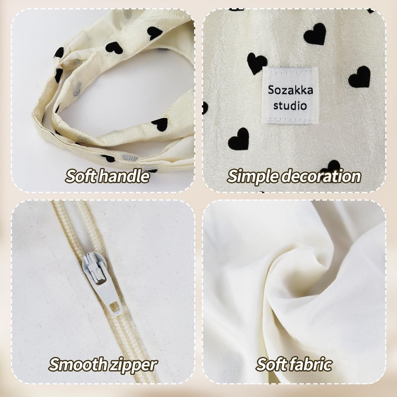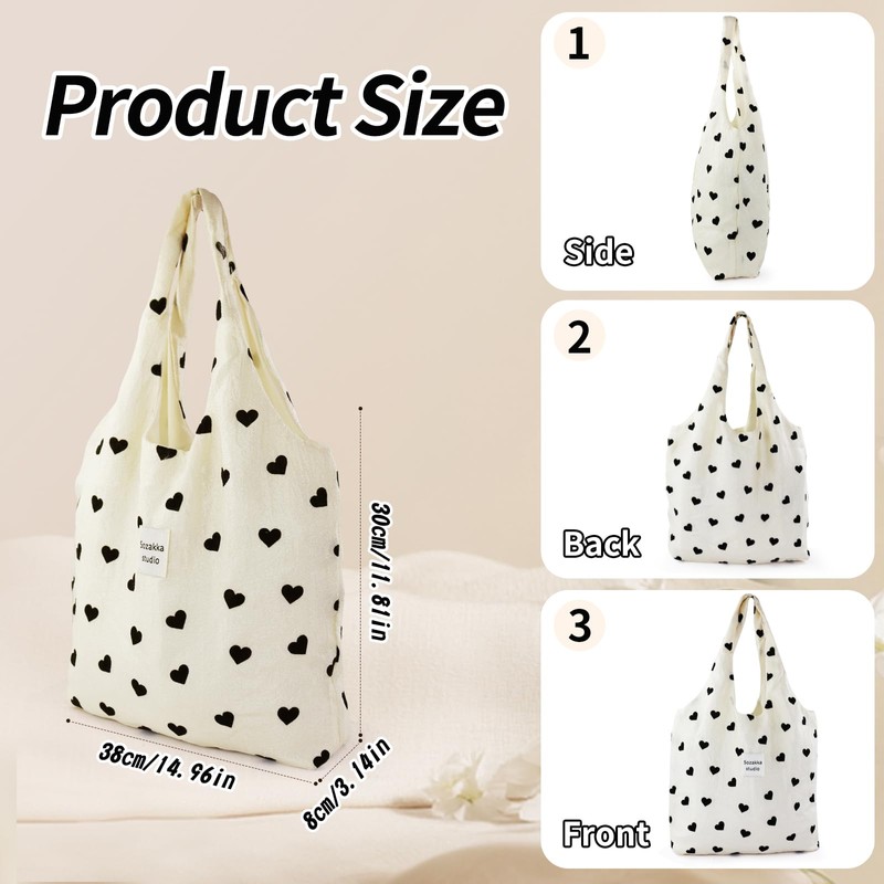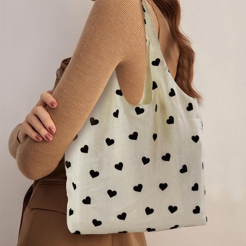 • Stylish and Beautiful: This simple modern tote is made of beautiful fabric that shines slightly under the sunlight, and the black heart-shaped pattern has a special suede feeling, which makes your outlook more dazzling