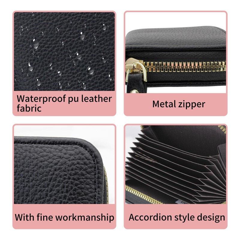 WisePoint Organ-Style Card Wallet, PU Leather Card Holder Wallet RFID Blocking Credit Card Holder for Women with Multi Card Slots, Portable Credit Card Case with Zipper (Black)