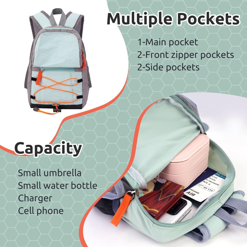 - Lightweight and Stylish: Our camping daypack is only about 0.315 lb(143.2 g), size in 9.06*4.3*11.82 inches(23*11*30 cm), it won't add a burden to your travel, and it can also hold the items you need for short-distance exercise