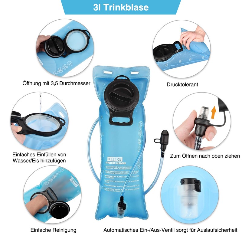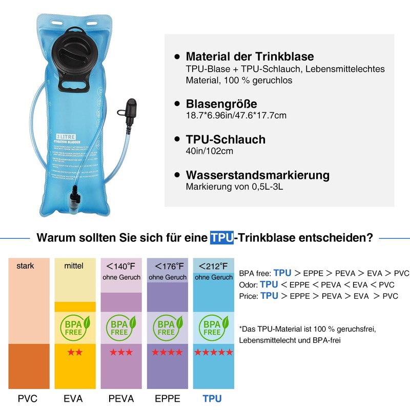 - BPA & Odor Free TPU Hydration Bladder - Our hiking hydration backpack features a 3L TPU hydration bladder that is BPA and odor free. The large capacity of 3L ensures sufficient water supply for a long, strenuous hiking or trekking day, or you can flexibly adjust your water supply to suit your needs.