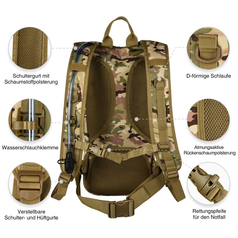 - Tactical Outdoor Hydration Backpack - Our hiking hydration backpack provides comprehensive features for hiking adventures and outdoor sports. The abrasion-resistant 900D nylon material, multiple pockets, a BPA and odor free TPU hydration bladder, a large capacity 3L hydration bladder, double attached shoulder and waist straps, and a tactical Molle compatible system integrate into a unique hiking hydration backpack.