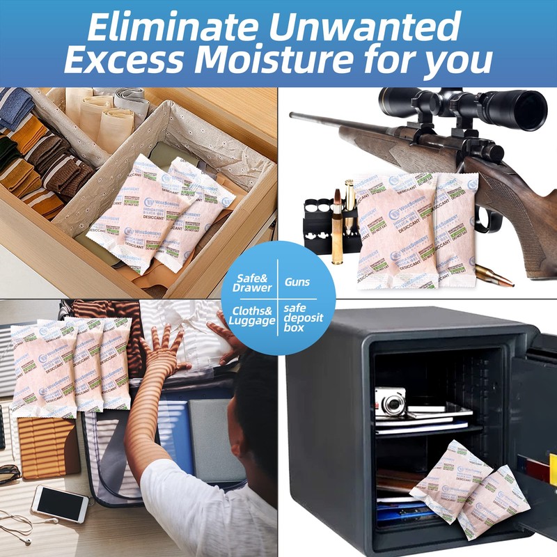 - The silica gel desiccant packets provide a better solution keep moisture from guns, important papers, legal papers, collectibles, books, jewelry, photo album, shoes, camera lens, toys, leather clothing, ammo, photo equipment,etc. This type of desiccant is also widely used in mental processing, machine manufacturing and electric manufacturing industries.