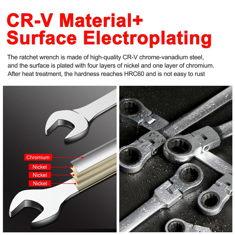 - 【High Quality Material】 The wrench is made of CR-V chrome-vanadium steel as a whole. After heat treatment, the hardness reaches HRC60, the torque is large, the wear resistance is good, the surface is plated with 4 layers of nickel and 1 layer of chromium, which is not easy to break, matt design, not easy to rust, and prolong the life of the wrench.