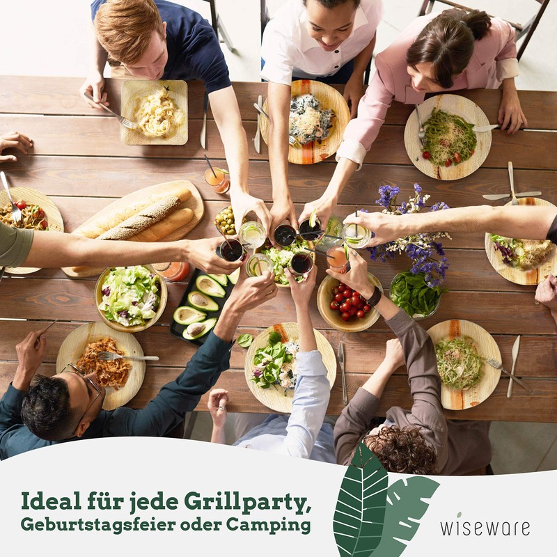 Unlike plastic and paper plates, palm leaf plates are more robust and dimensionally stable than paper plates. In addition, plates made of palm leaf are waterproof and cut resistant. It is also particularly practical that palm leaf plates are microwave-safe. Palm leaf tableware is suitable for all celebrations and events such as family and birthday parties, barbecue parties, and weddings, but is also ideal for the professional catering and catering sector.