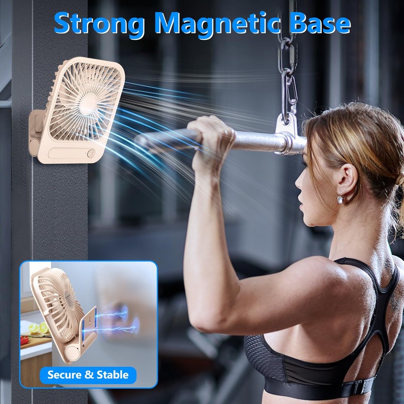 - đăStrong Magnetic Base & Versatile PlacementăMagnetic Base Fan, features a powerful magnetic base that securely attaches to any metal surface (refrigerators, gym equipment, etc.), perfect for kitchen, cruise ship cabins, or workshops. Ideal for travel fans needing hands-free cooling.
