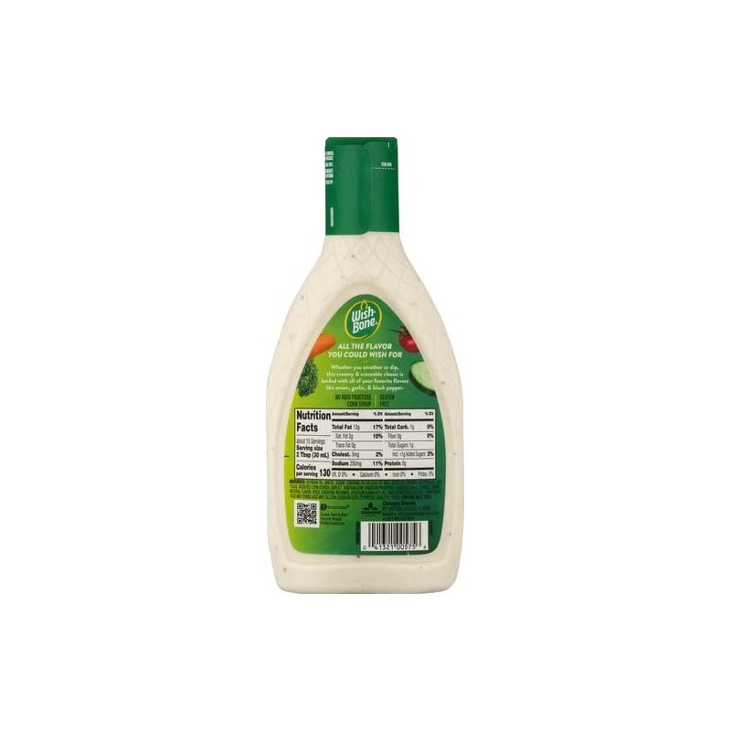 Wish-Bone Ranch Dressing adds bold flavor to your favorite recipes. Onion, garlic and black pepper make this ranch salad dressing irresistible. This thick and creamy salad dressing delivers great texture and flavor to all your dishes. Wish-Bone Ranch Dressing is a gluten free salad dressing made without high fructose corn syrup. Pour this creamy ranch dressing over fresh salads, toss it in with vegetables or serve it as a dip. A 15 fluid ounce squeeze salad dressing bottle makes it easy to dispense the perfect amount. Refrigerate the dressing after opening. From creamy ranch to robust Italian dressings, Wish-Bone has what you need to make your dishes amazing.