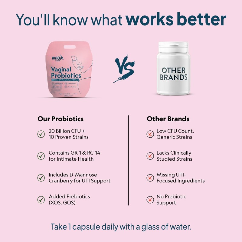 Product description Wish Fusion Vaginal Probiotics - 20 Billion CFU | 10 Powerful StrainsSupport your feminine health with Wish Fusion Vaginal Probiotics, expertly formulated with 20 Billion CFU active cultures and 10 clinically researched probiotic strains. Designed to help restore balance, fight odor, support yeast defense, and maintain a healthy pH level all in one easy-to-take daily capsule. Key Benefits:Maintains Intimate Flora: Helps restore and sustain a healthy vaginal microbiome for everyday freshness and comfort. Promotes pH Balance: Supports optimal vaginal pH to help reduce irritation, itching, and dryness. Odor Control & Yeast Defense: Naturally supports odor and yeast control without synthetic ingredients. Lab-Tested & Vegan: 100% vegan-friendly, Non-GMO, soy-free, and gluten-freelab-tested for safety and quality. 60 Vegan Capsules: One-month supply in a convenient resealable pouch. Easy to swallow and gentle on the stomach. Why Choose Wish Fusion?Our probiotics are developed by experts and manufactured in a certified facility with strict quality standards. Each batch is lab-tested to ensure the highest potency and purity for your peace of mind.Empower your feminine wellness today with Wish Fusionwhere health meets confidence.IngredientsLactobacillus rhamnosus, Lactobacillus reuteri, Lactobacillus fermentum, Lactobacillus acidophilus, Bifidobacterium lactis, Lactobacillus plantarum , Xylooligosaccharides (XOS), D-Mannose, Pineapple Powder, Cranberry Extract, Galacto-oligosaccharides (GOS), Vitamin C (Ascorbic Acid)