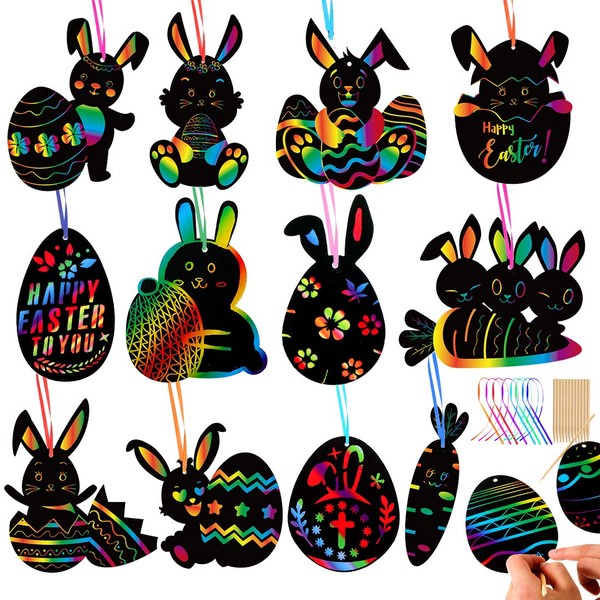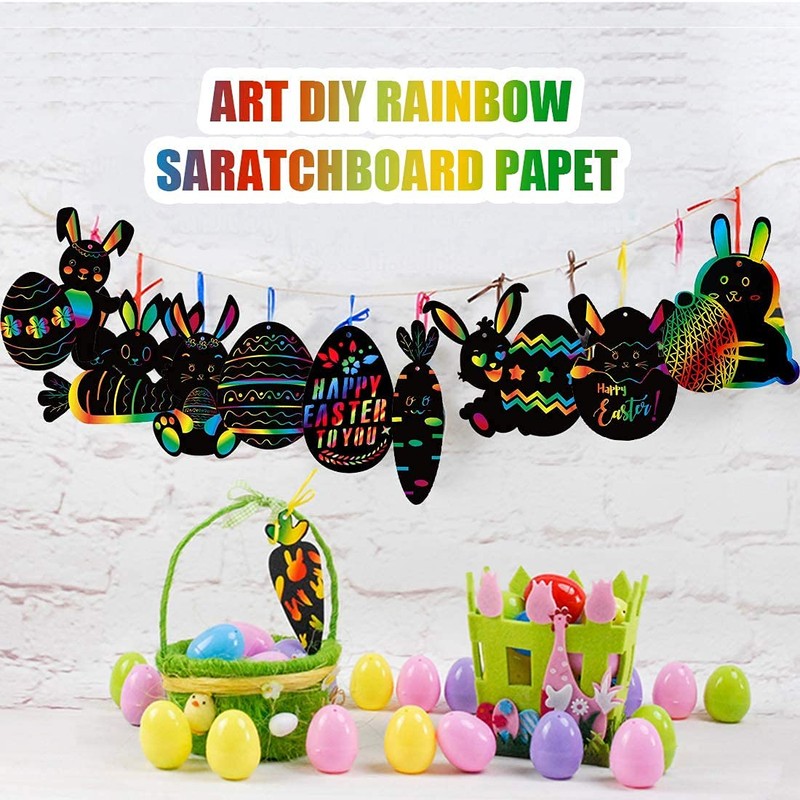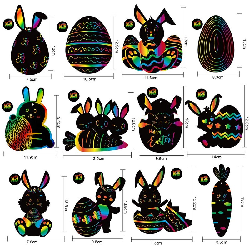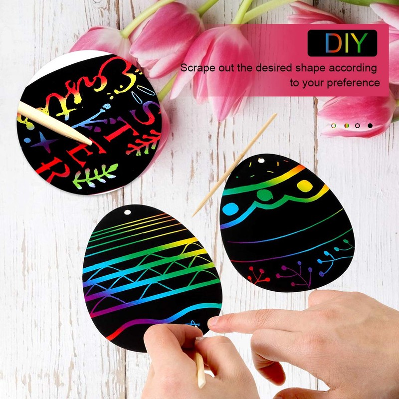 - ✔ DIY DESIGN The rainbow color is hidden under the black of the Easter egg scratch off card. Children only need to scratch the black with the included wooden pen to create their own patterns.