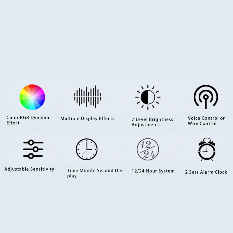 Funciones principales: 20 modos de visualización de espectro, 7 modos de color, 1-7 niveles de configuración de brillo , 4 modos de visualización de la hora, 1 modo de visualización de respiración, función de alarma de 2 vías, función de luz nocturna de 1 vía