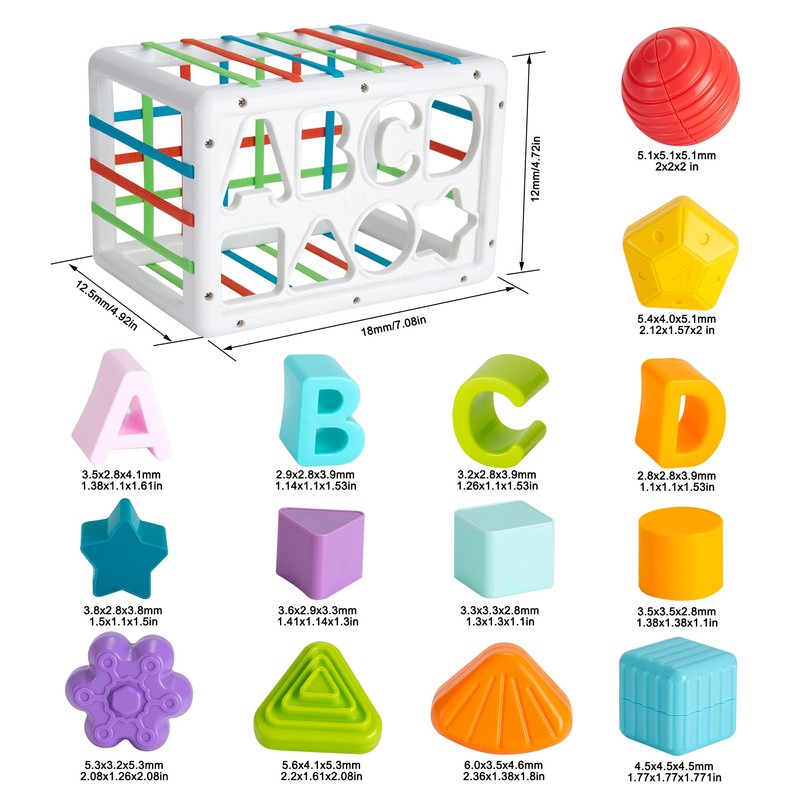 - Stimulate kid's curiosity: the colourful sensory sorting box stimulates children's interest in pushing the shape blocks through the elastic bands of the cube, and children think about how to take out the shape, which trains children's thinking ability.