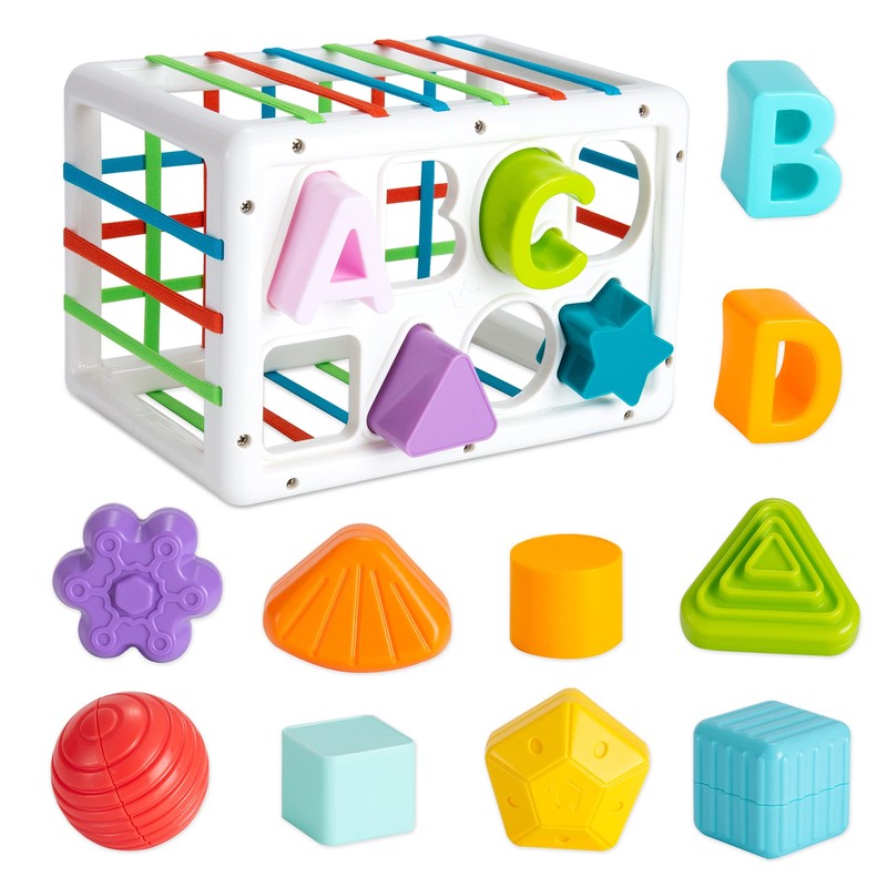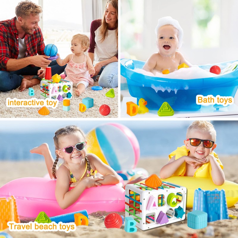 - Baby sensory toy: baby pushes the blocks into the sensory container either from the elastic bands or the matching holes and takes them out, gripping, pushing and stacking is a good way to improve baby's fine motor skills. Shape sorter toy for 6-18 months baby boys and girls.