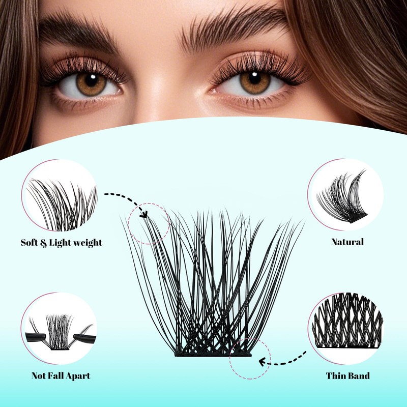 - 【Ultra-Thin & Soft Band Eye Lashes】These cluster eyelash extensions feature a knot-free, ultra-thin lash band that blends easily with your natural lashes. The soft and flexible band ensures comfortable wear all day while delivering a more defined, lifted lash effect across all eye shapes.