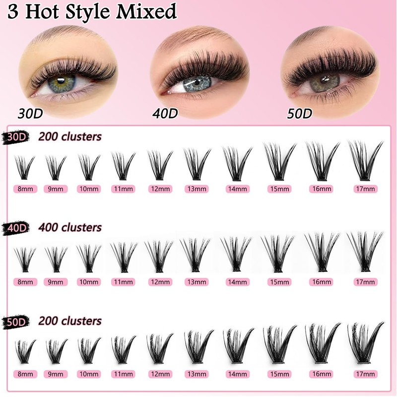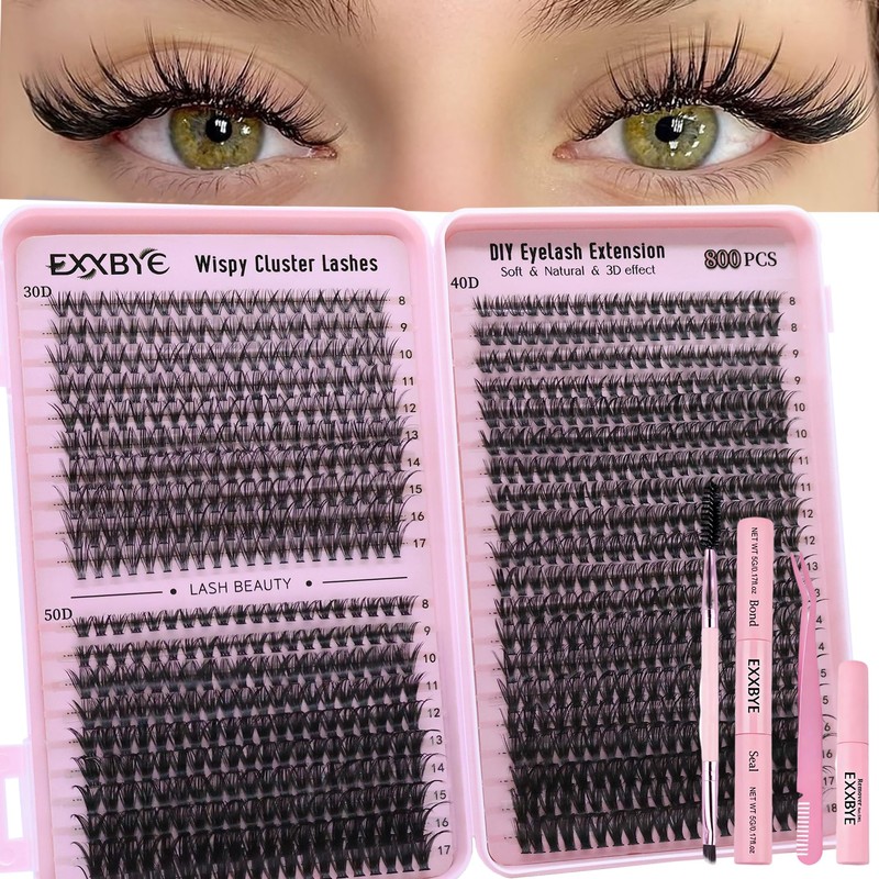- EXXBYE Lashes Kit Include: 800pcs Lashes Cluster (30D&40D&50D, 8-18mm), Lash bond and seal, Lash remover, Lash brush, Lash Tweezers. Whatever it's for daily work, students attending classes, or exquisite makeup for important occasions, this Lashes set can meet the needs.