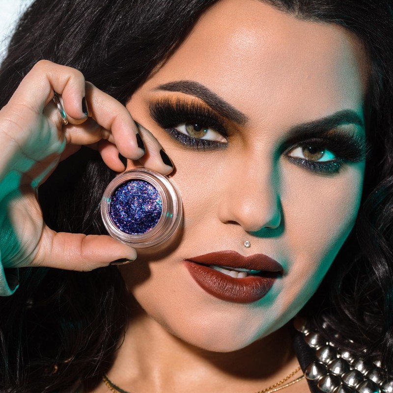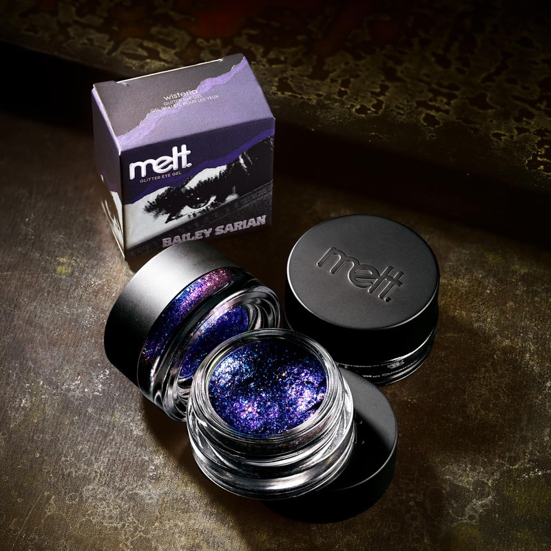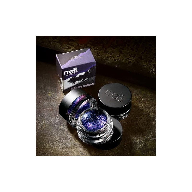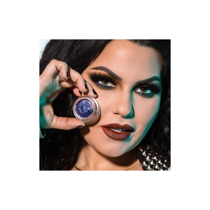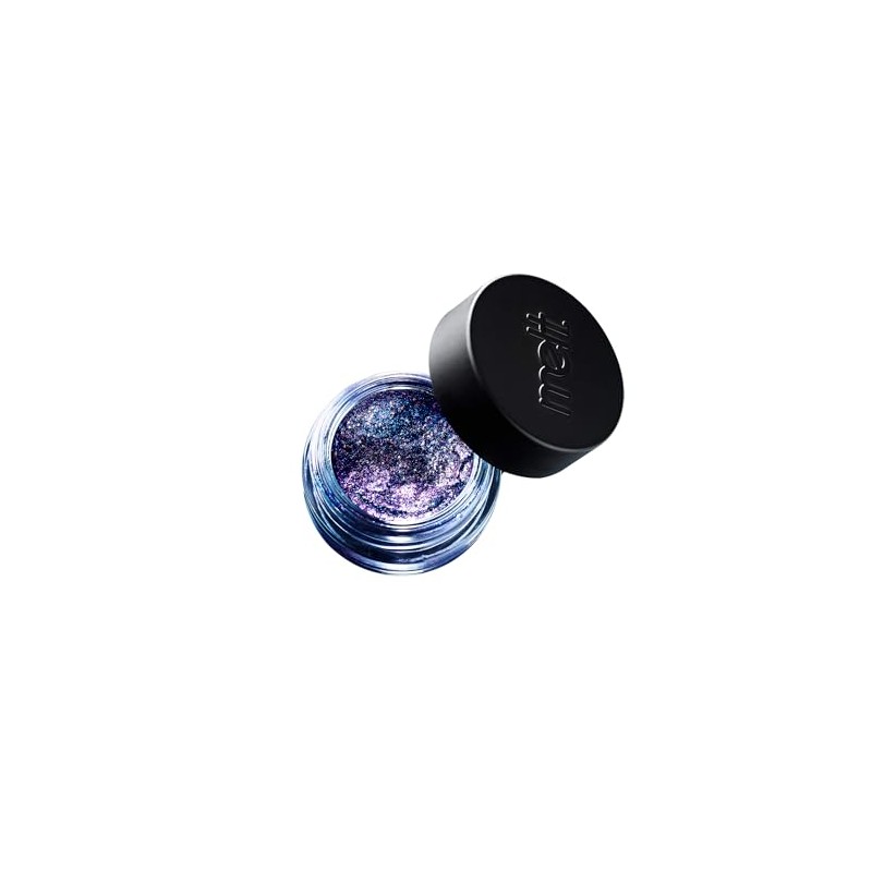 A violet sheer base, packed with tiny blue and purple shimmers and multi-dimensional glitters. Refracts different colors when the light hits different angles. Mess free, with a clear self-adhesive gel base, without needing glitter glue. Perfect for topping off any eyeshadow look.