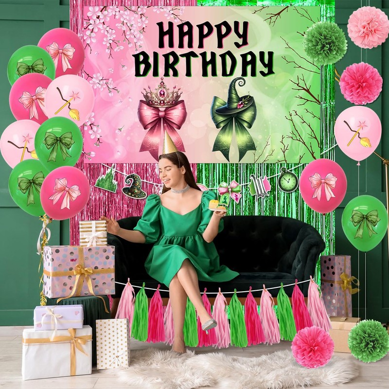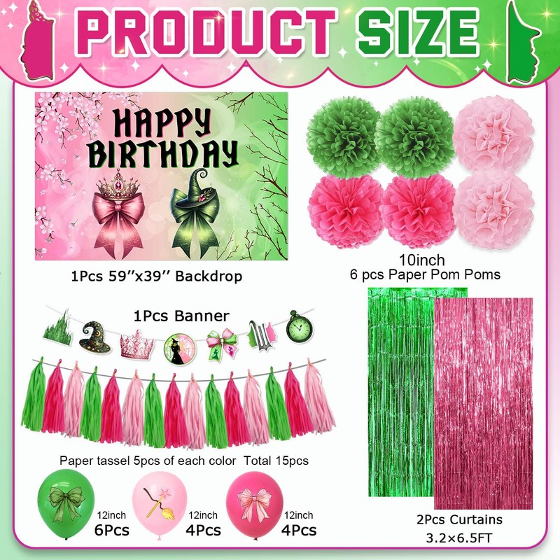 - Birthday Party Decorations: The witch birthday supplies included 1pc "HAPPY BIRTHDAY" backdrop,1pc banner with cards,15pcs pink and green tassel,1pc pink and green fringe curtain,6pcs paper pom poms,14pcs balloons
