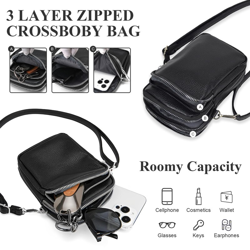- 【Spacious Space for Storage】Three zipper pockets design, providing ample space for most of your essential items. Meaning you can store mobile phones, sunglasses, headphones, credit cards, keys, money, drivers license and small cosmetic ( chapstick / perfume / makeup mirror/ lotion). Alternatively the small purses for women crossbody can keep your hands free for other tasks and easily fits inside a backpack for traveling.
