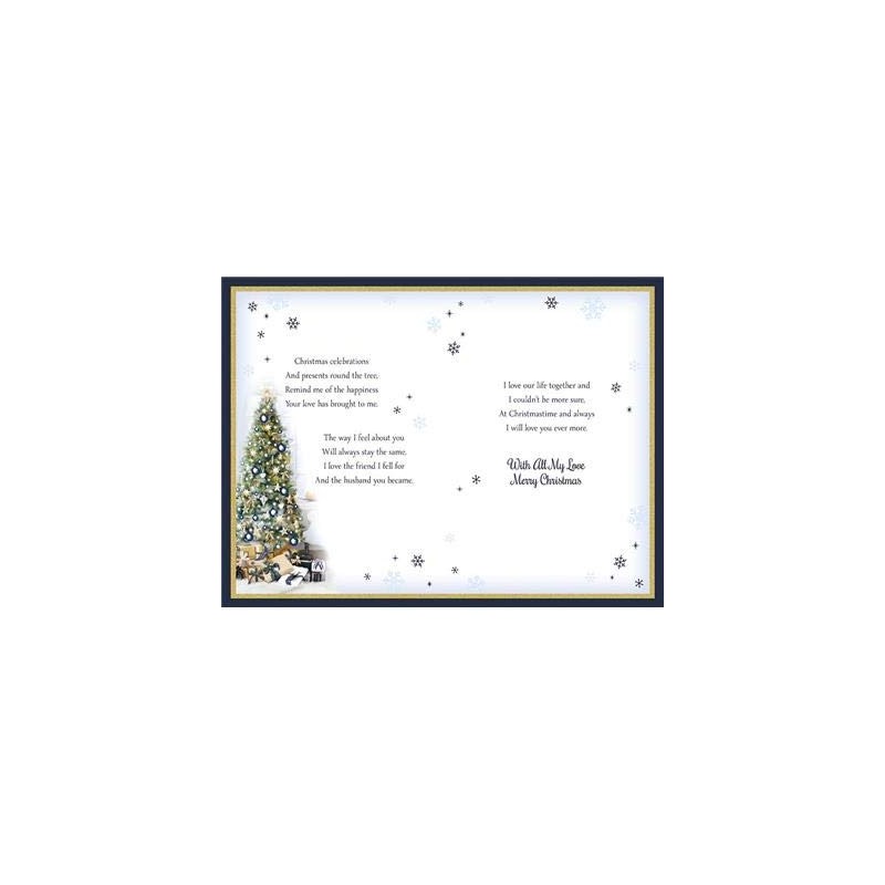 - The Greeting Inside Reads: Christmas celebrations And presents round the tree, Remind me of the happiness Your love has brought to me. The way I feel about you Will always stay the same, I love the friend I fell for And the husband you family. I love our life together and I couldn't be more sure, At Christmastime and always I will love you ever more. With all My Love Merry Christmas.