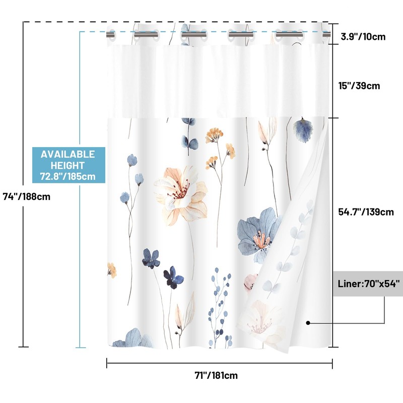 - Measures - Shower curtain 71'W x 74'H inches (181X188 cm) ,fits your standard sized bathroom, snap in liner is 70'W x 54'H inches (176X136 cm)