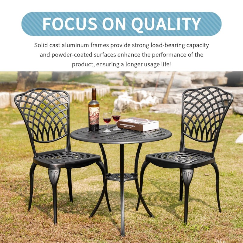 - 【Durable Cast Aluminum Bistro Set】: Bistro set 3 piece outdoor is made of durable cast aluminum material. It is very solid, durable, light and easy to move. It is very suitable for family dinner and a beautiful landscape of your garden