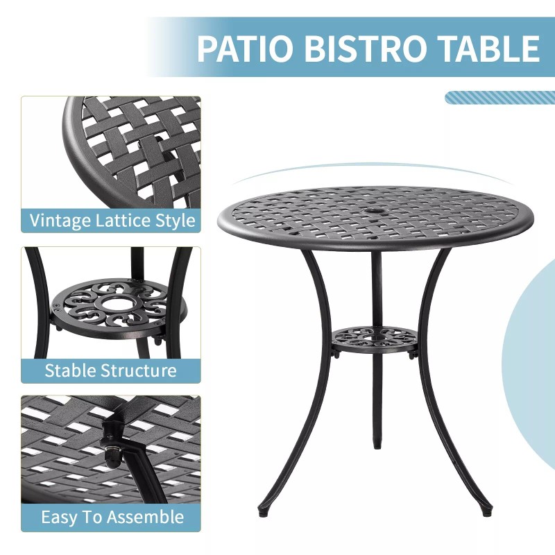 - 【All Weather Outdoor Bistro Set】 :The small outdoor table and chairs have a rust proof coating on the surface, which can be used all day without fading and aging. It is an ideal choice for the front porch, balcony and deck. With 1.97 inch umbrella hole, it can put a patio umbrella (not included) for sun shading and rain