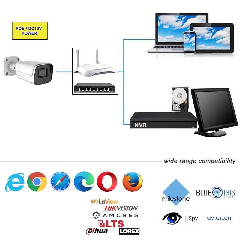 - 【Easy Installing & Setup】WiTi IP420/50 Works with NVR, PC client and Browser, APP on iOS and Android. It is compatible with the most main brands 5MP NVR e.g. Laview, LTS,Amcrest,Dahua,Hikvision,etc. Free PC client software and APP are provided. it also works on on ISpy, Blueiris, Milestone, and browsers e.g. IE, Edge,Firefox, Google Chrome,Opera,etc.