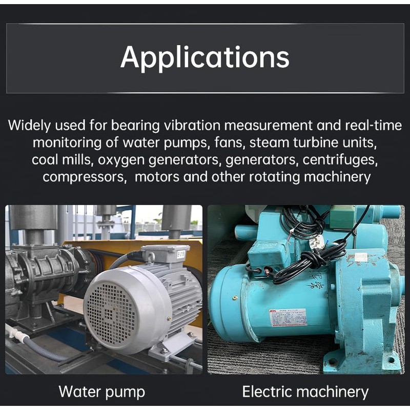 - Suitable for monitoring the condition of most machines: Widely used for water pumps, devices, generators, motors and other rotating machines. By analyzing machine vibrations in real time, damage to machines is effectively prevented.