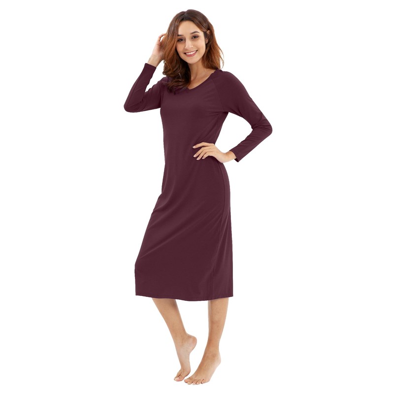 WiWi Nightgowns for Women Soft Viscose from Bamboo Long Sleeve Nightshirts Sleepwear Plus Size Nightshirts S-3X, Fig Red, Medium