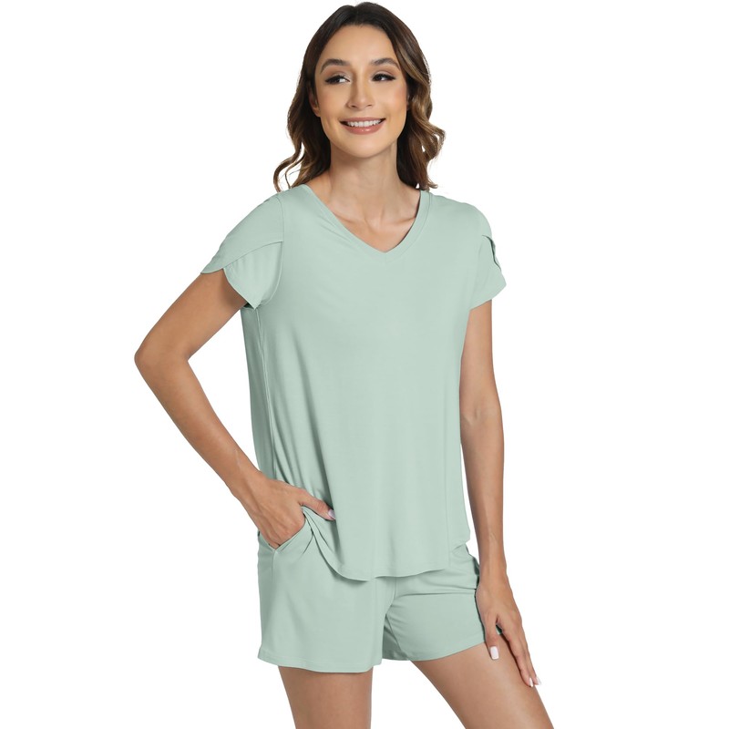 WiWi Pajamas for Women Short Sleeve Top and Shorts Sets Viscose from Bamboo Pj Sleepwear Pajama Set S-XXL, Cameo Green, Small