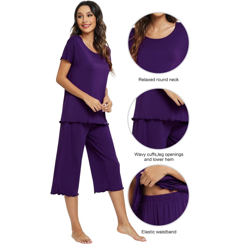WiWi Pajamas for Women Soft Pajama Sets Short Sleeve Top Capri Pants Viscose from Bamboo Sleepwear Pjs Loungewear S-4X, Dark Purple, Medium