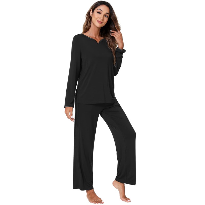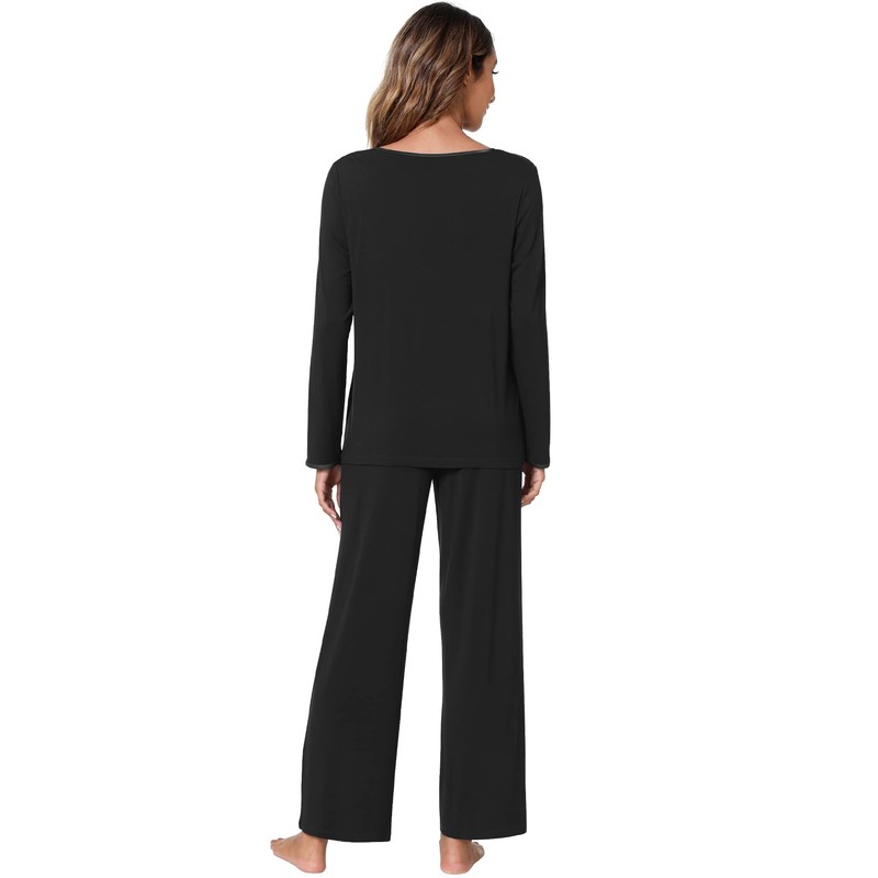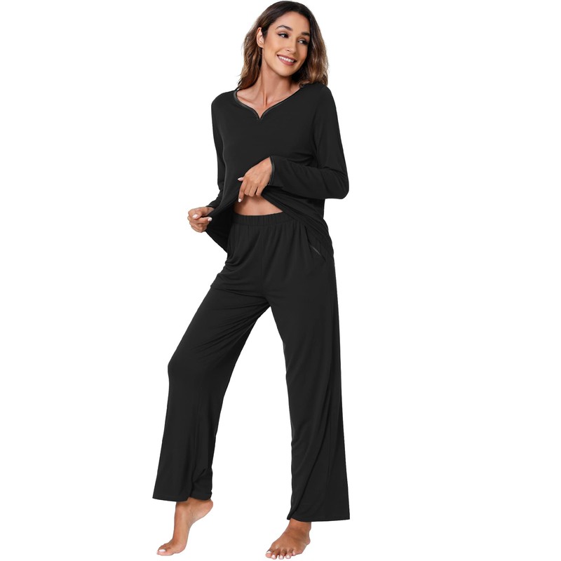 WiWi Pajamas Set for Women Long Sleeve Sleepwear with Pants Lounge Pjs with Pockets Viscose from Bamboo S-XXL, Black, Large