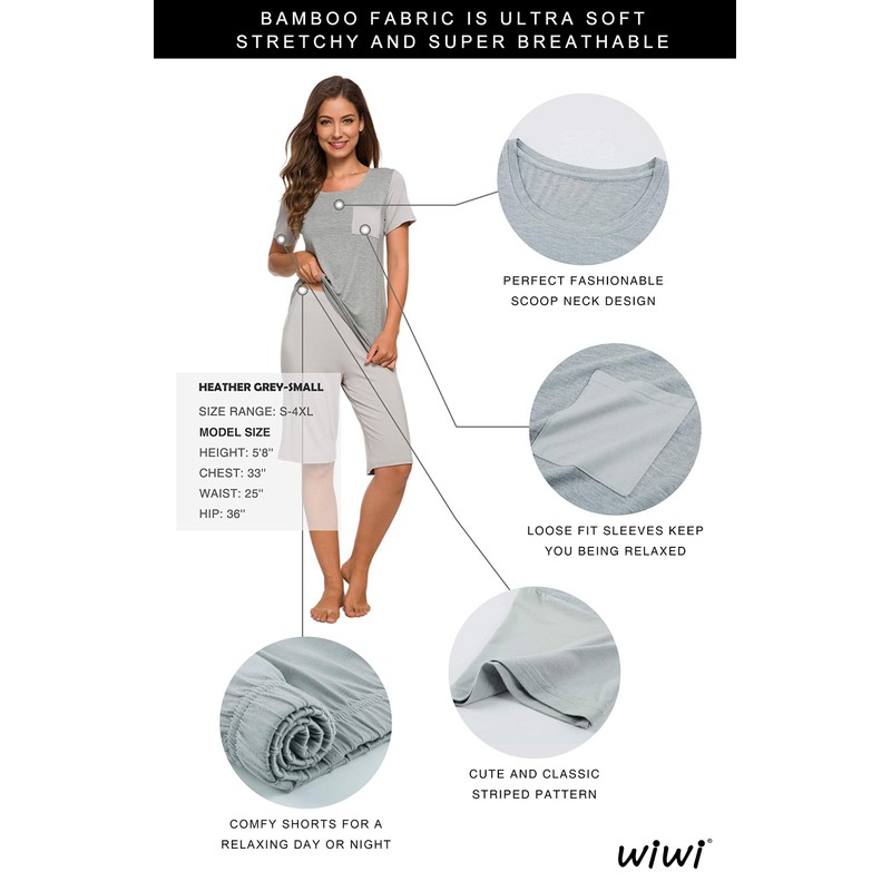 WiWi Pajamas Set for Women Short Sleeve Top with Shorts Pajama Sets Summer Plus Size Pjs Soft Viscose from Bamboo Loungewear S-4X, Iron Grey, Large