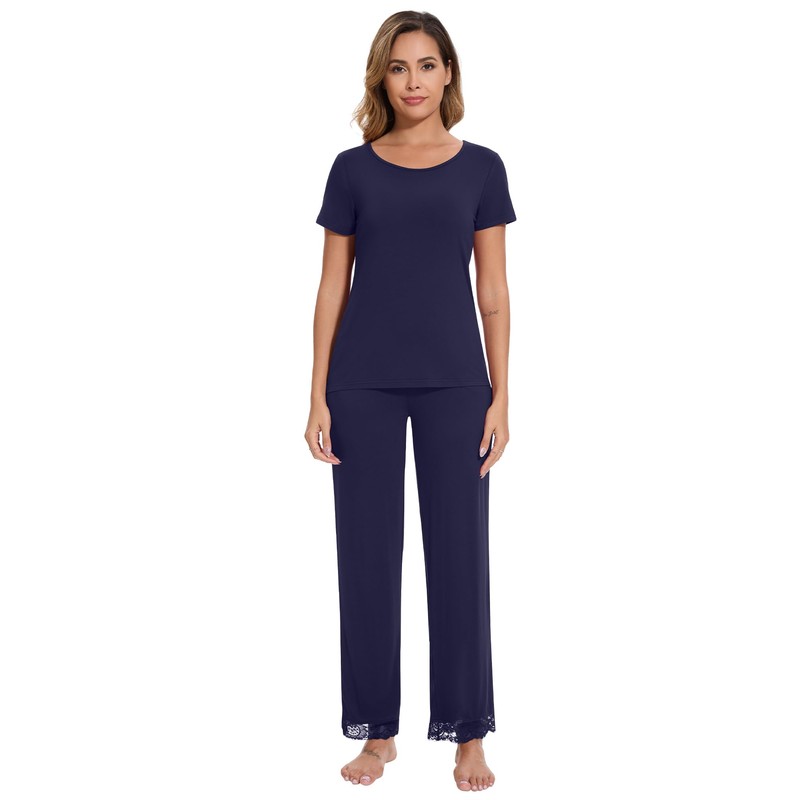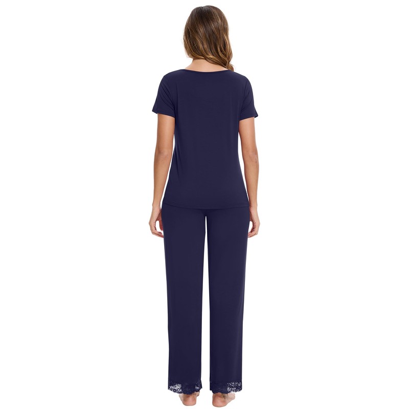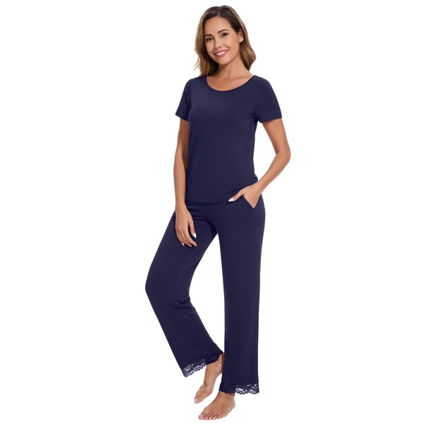WiWi Pajamas Set for Women Soft Comfy Loungewear Short Sleeve Tops and Long Pants Viscose from Bamboo Sleepwear Pjs S-XXL, Navy, XX-Large