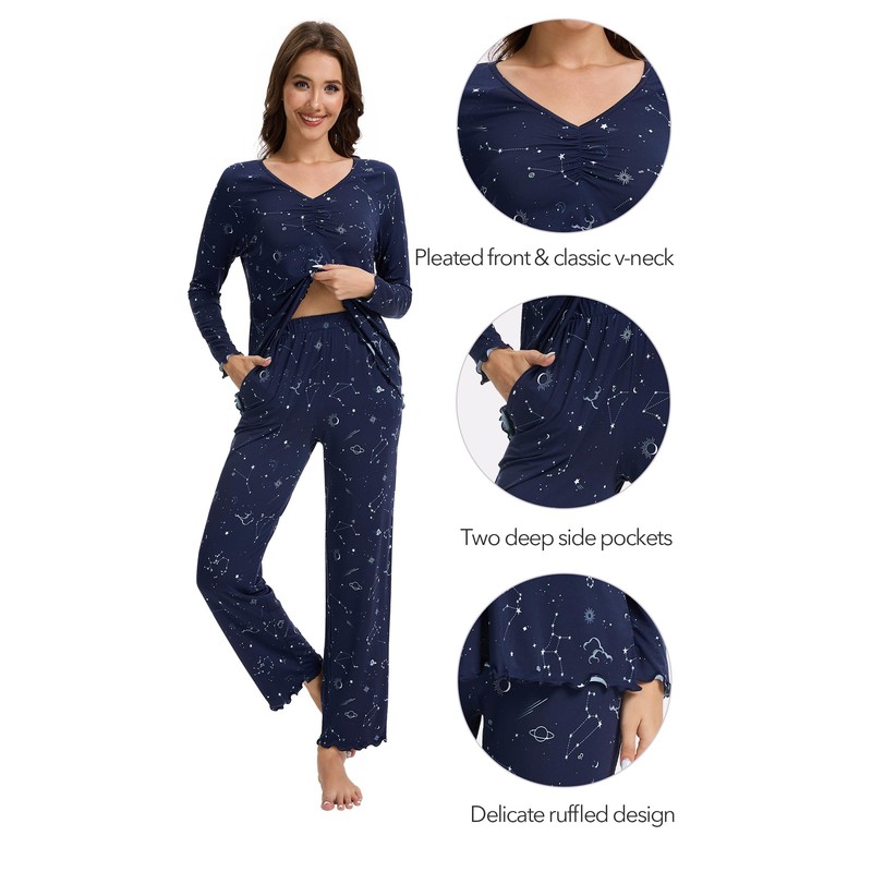 WiWi Viscose from Bamboo Pajama Sets for Women Soft Pjs Loungewear Short Sleeve Top with Pants Sleepwear Pajamas S-XXL, B-blue Constellation, X-Large