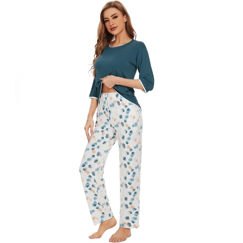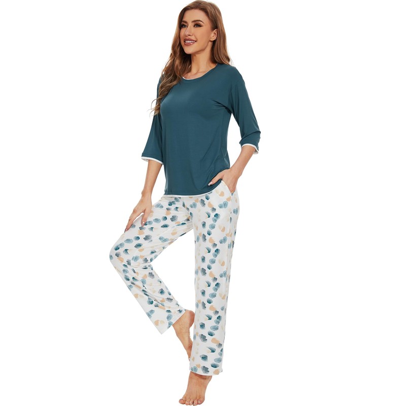 WiWi Womens 3/4 Sleeve Pajamas Set Soft Viscose from Bamboo Top with Pants Sleepwear Plus Size Lightweight Pjs S-4X, White/Green Dots, Medium