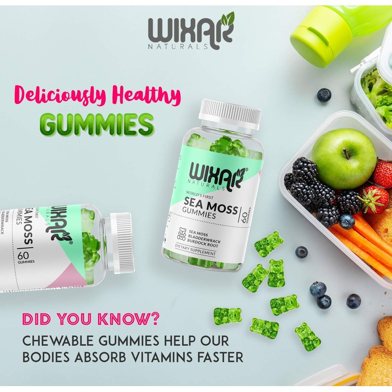 - SEA MOSS SUPERFOOD GUMMIES – Our Wixar Naturals SeaMoss Supreme gummies are Made with 1600mg of Irish Sea Moss , 1000mg of Bladderwack , and 240mg of Burdockroot per serving to help deliver 102 vitamins and minerals that the body needs to maintain a healthy Life Style.. Also Chewable gummies help our bodies absorb vitamins faster.