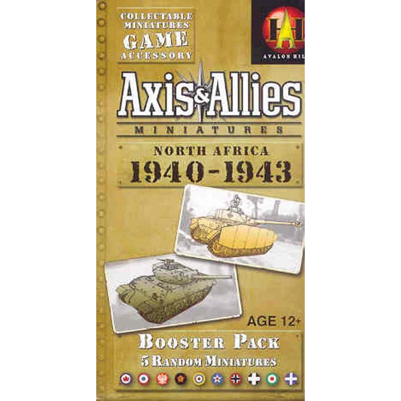 Roll across the sands and onto Victory! Get ready for the new _Axis & Allies_TM _Miniatures North Africa 1940-1943_ expansion. With 60 pre-painted detailed miniatures, players will be able to assemble armies ready to do battle across the desert battlefields of the North African campaign. Fast-paced and action-packed, this exciting miniatures game will let players recreate historical battles or go head-to-head in competitive skirmishes that rage across massive 20"x 30" battle maps. Each _Axis & Allies North Africa 1940 - 1943_ Booster Pack contains 5 prepainted plastic miniatures with stat cards.